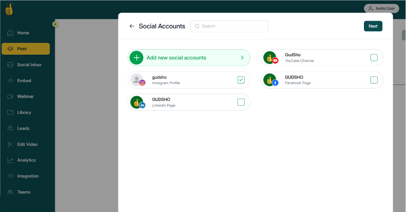 - Now select Social Accounts in which you want to schedule your posts. As we are speaking about Instagram here, select your Instagram account.