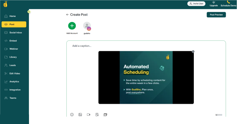 GUDSHO is an advanced, next-level social media management platform. It lets you edit, schedule, host, share and promote content across popular social media channels and webpages. You can drive social engagement and website traffic all from one unified dashboard.