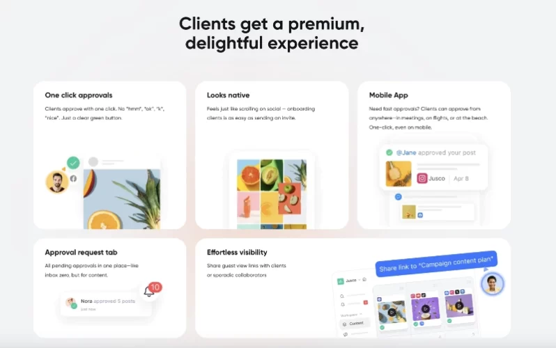 - Internal posts and team-only comments keep work-in-progress content hidden from clients until it’s ready.