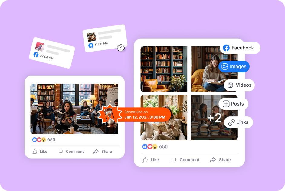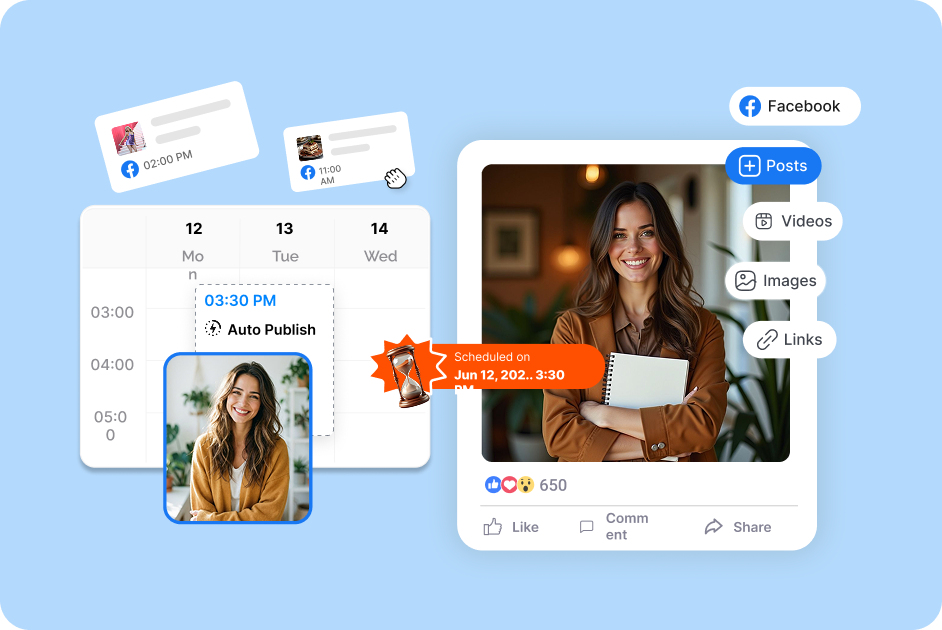 Simplify content scheduling for 100+ Facebook posts, ensuring smooth, timely delivery without needing manual effort.