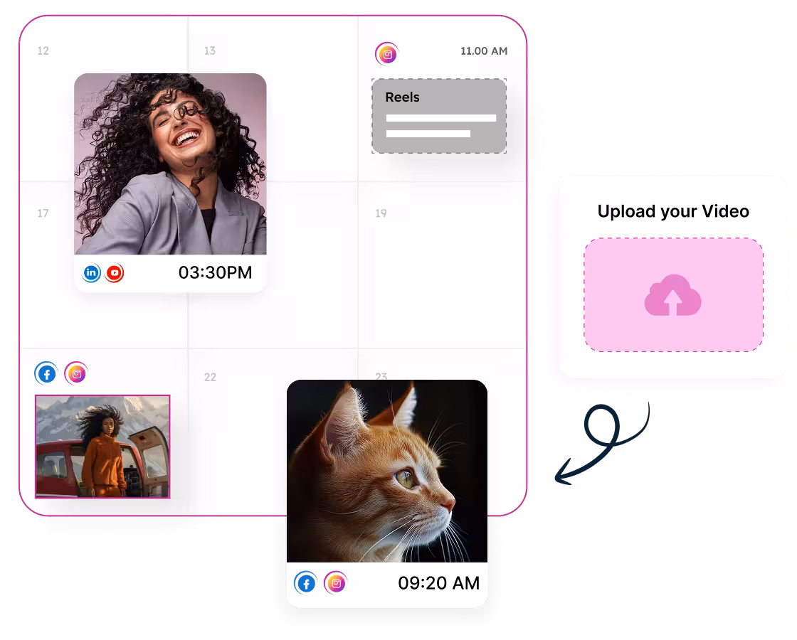 Upload or edit posts instantly, choose the format (Post or Reel) and schedule content across 30+ social accounts in any time zone.