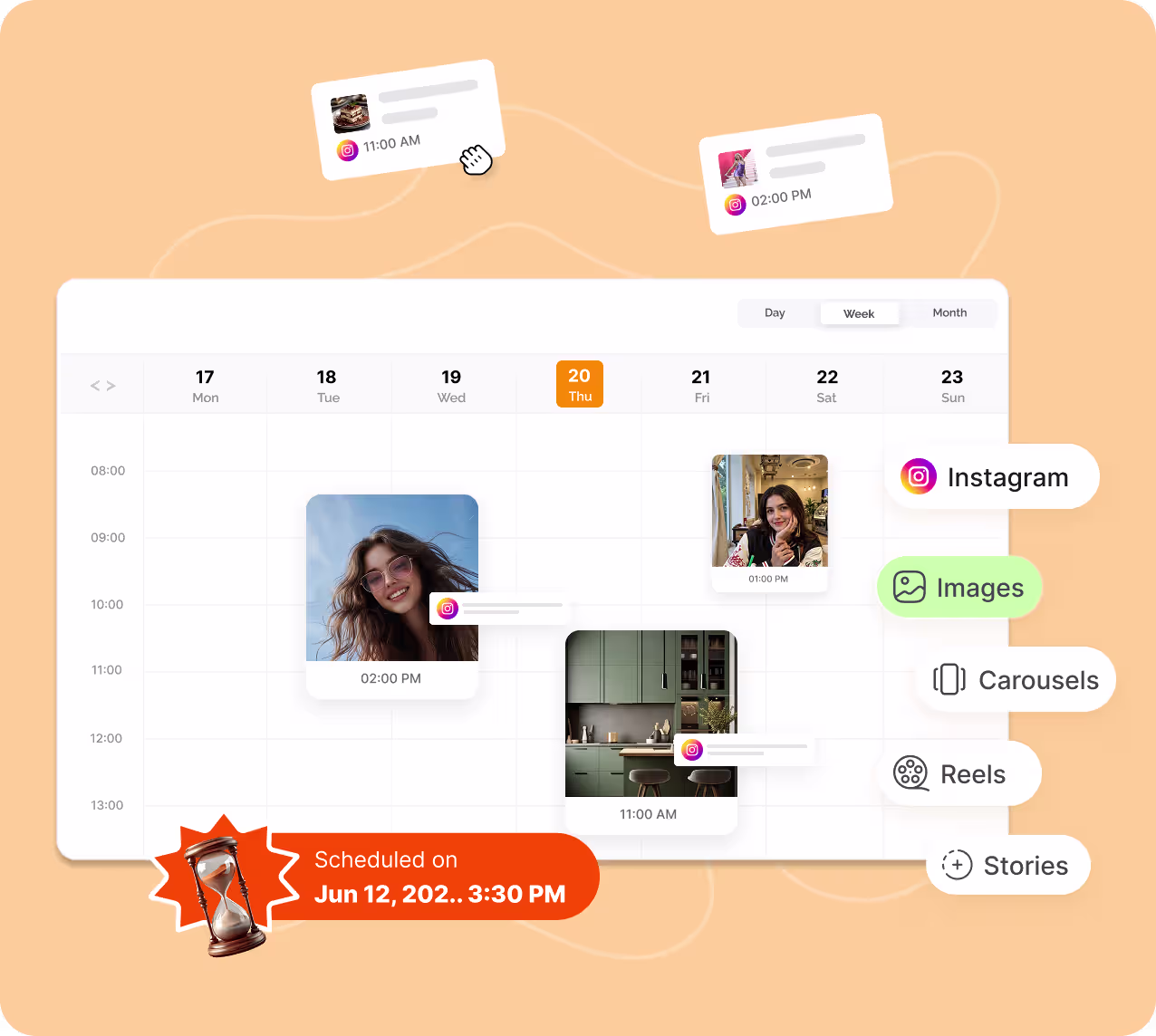 Instantly schedule hundreds of posts, Reels and Stories to automate sharing with a consistent posting window.